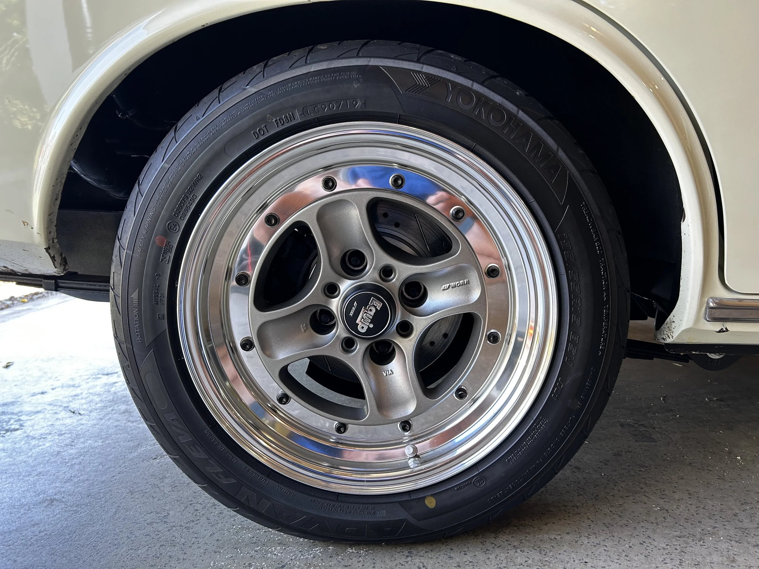 What are the right wheels for a wagon? There are some great historic wheel choices for the 510. Watanabe’s and Panasports being two of those. I love the look of Watanabe’s and the fact they are from Japan would be keeping the theme of using Japanese specific modifications. But those wheels lean towards the racing/trans-am vibe not the station wagon vibe. I really liked the classic three piece wheel trend that applied to a couple different tuner/hot-rod trends in Japan. But I didn’t want to use some of the original wheels because they tend to be 13” or 14”, which wouldn’t allow for slightly bigger brakes. I only wanted to go up to 15” wheels, which help from a performance standpoint, but don’t upset the proportions of the car.