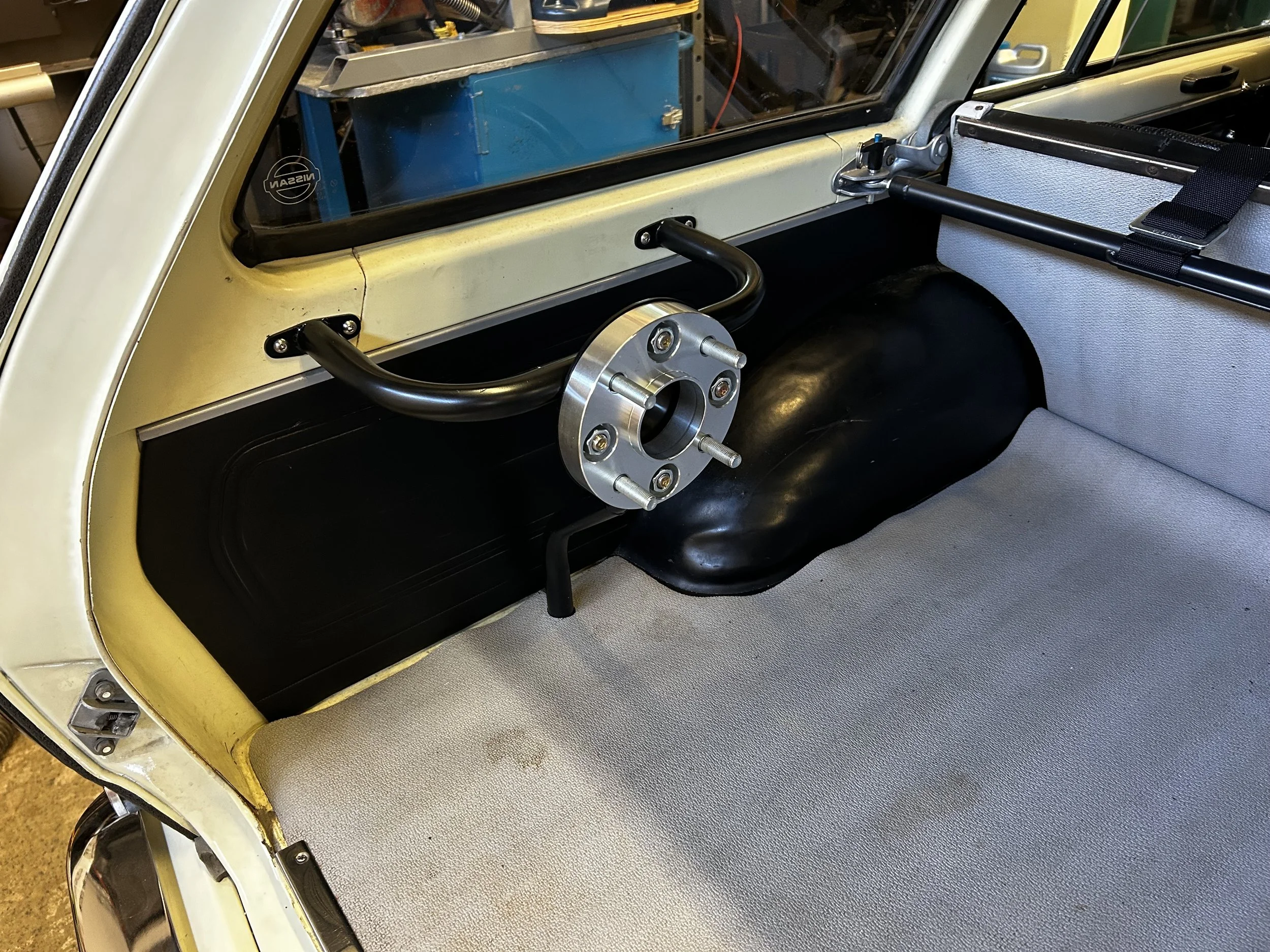 Where to store a spare? Since I upgraded the wheels and brakes, the traditional spare wouldn’t work anymore. Taking inspiration from 80’s SUVs and Baja trucks, I wanted to mount a full size spare in the wagon area. After trying a couple locations, the tire fit really well along the driver side window. This location didn’t take up too much space and had good mounting points.