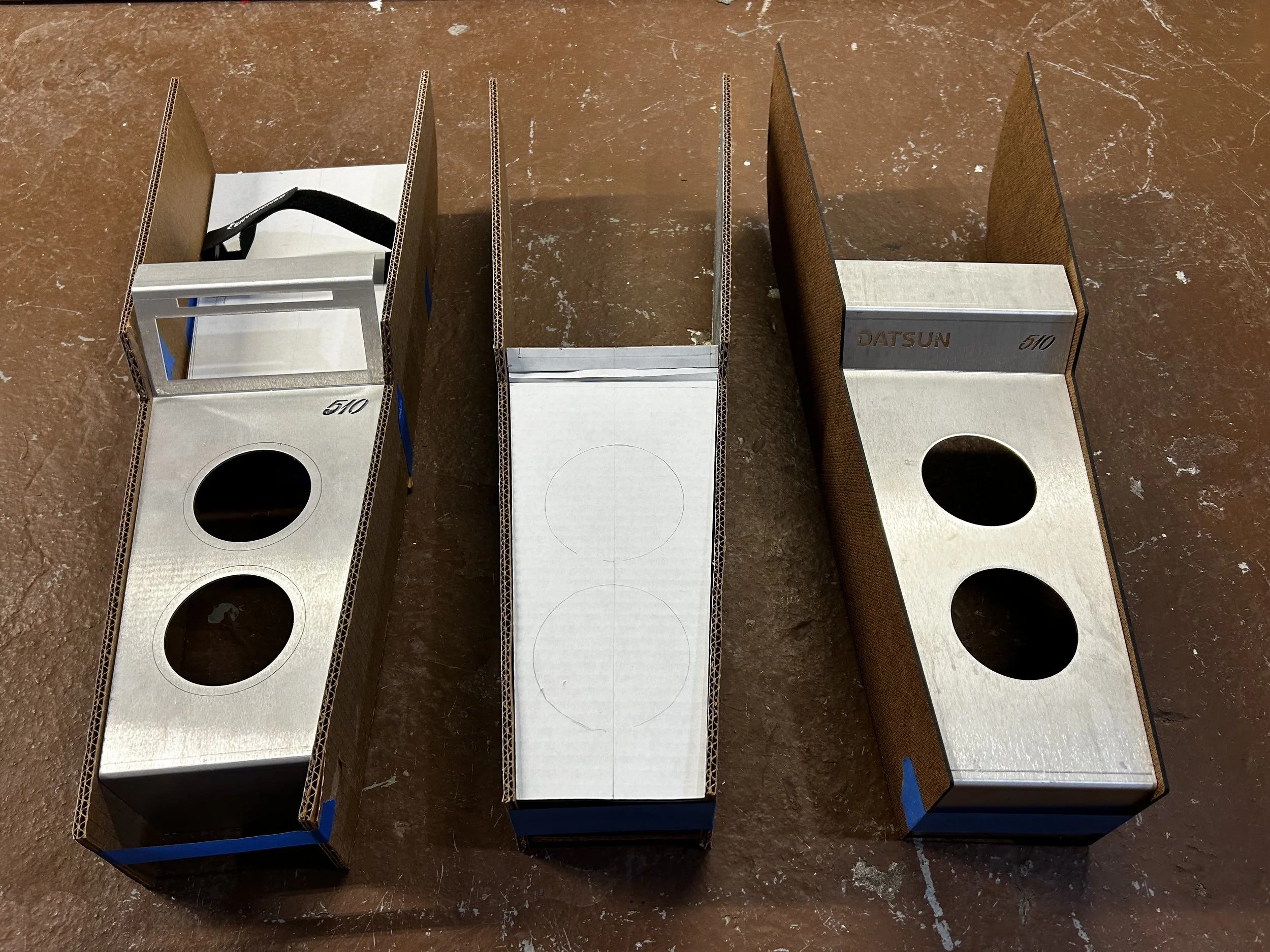 Where does my coffee go? The design of the dashboard will get extremely simplified, removing the controls and hole for the radio. In 1971, it made sense to have a radio and wired speakers. Today, everything is in our phones, which gives you the freedom to hide and remove the entertainment functions. With that change in the dashboard, the center console will hold two beverages as well as a bluetooth speaker. The sides will be wrapped in leather, the center is a custom laser cut aluminum part. Towards the firewall there is a cavity to securely store a bluetooth speaker and will have a fabric cover on top. Next step is getting the sides laser cut in birch plywood to create the final form for the upholsterer.