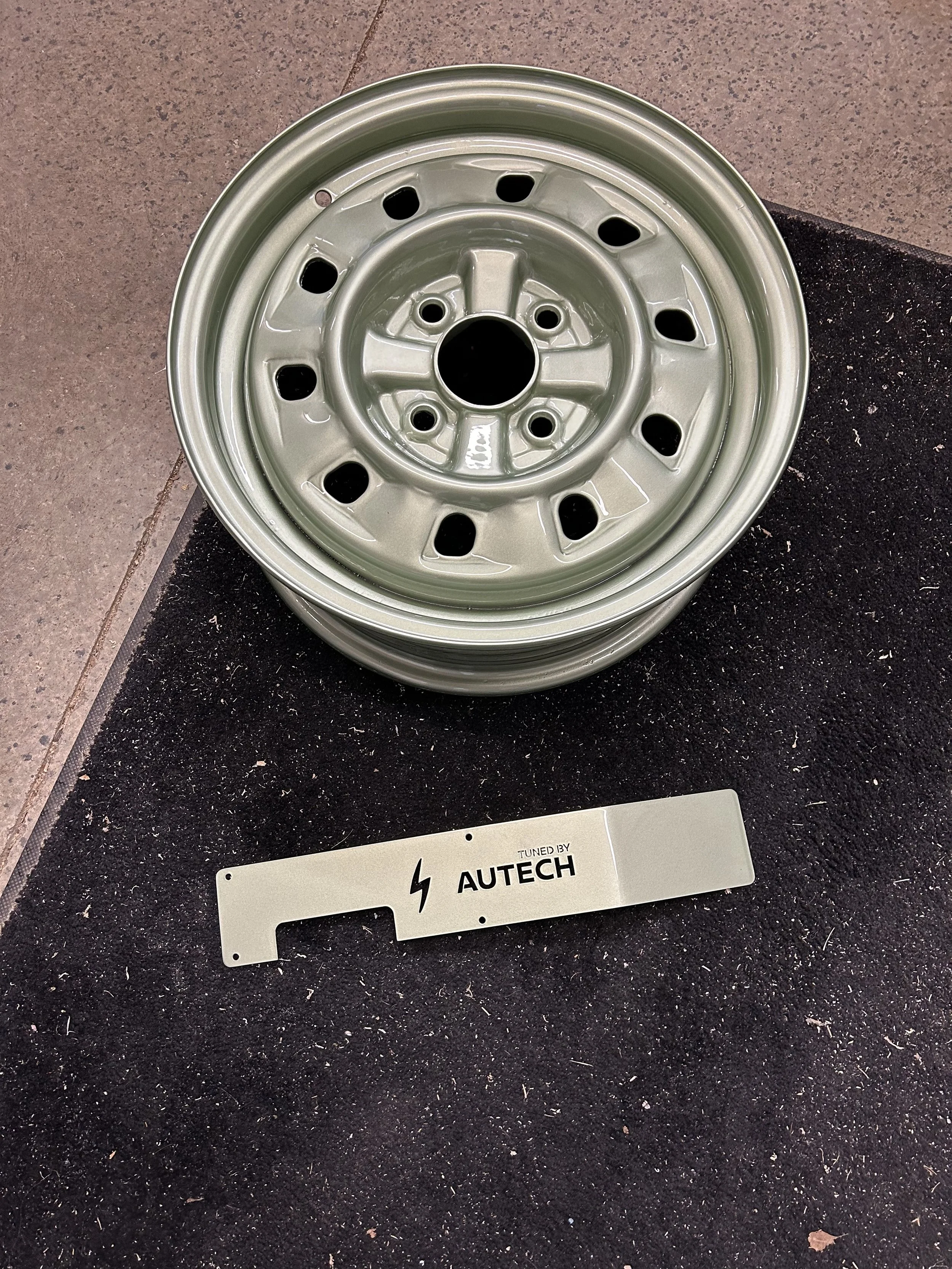 The steel wheel is from a 1989 Nissan Silvia (240SX) painted Green Mist Metallic to match the engine bay. Behind the wheel is a custom fabricated mount.