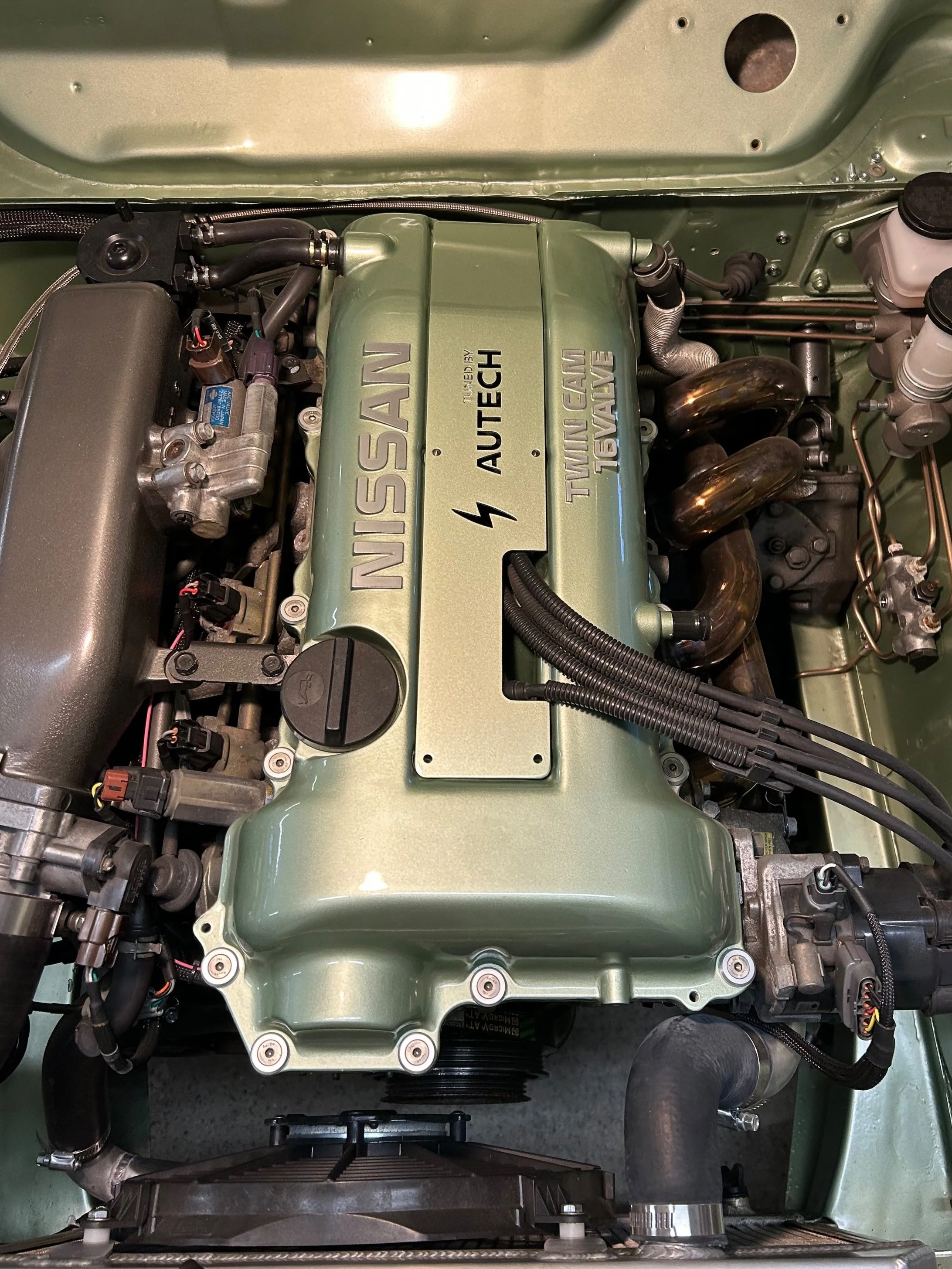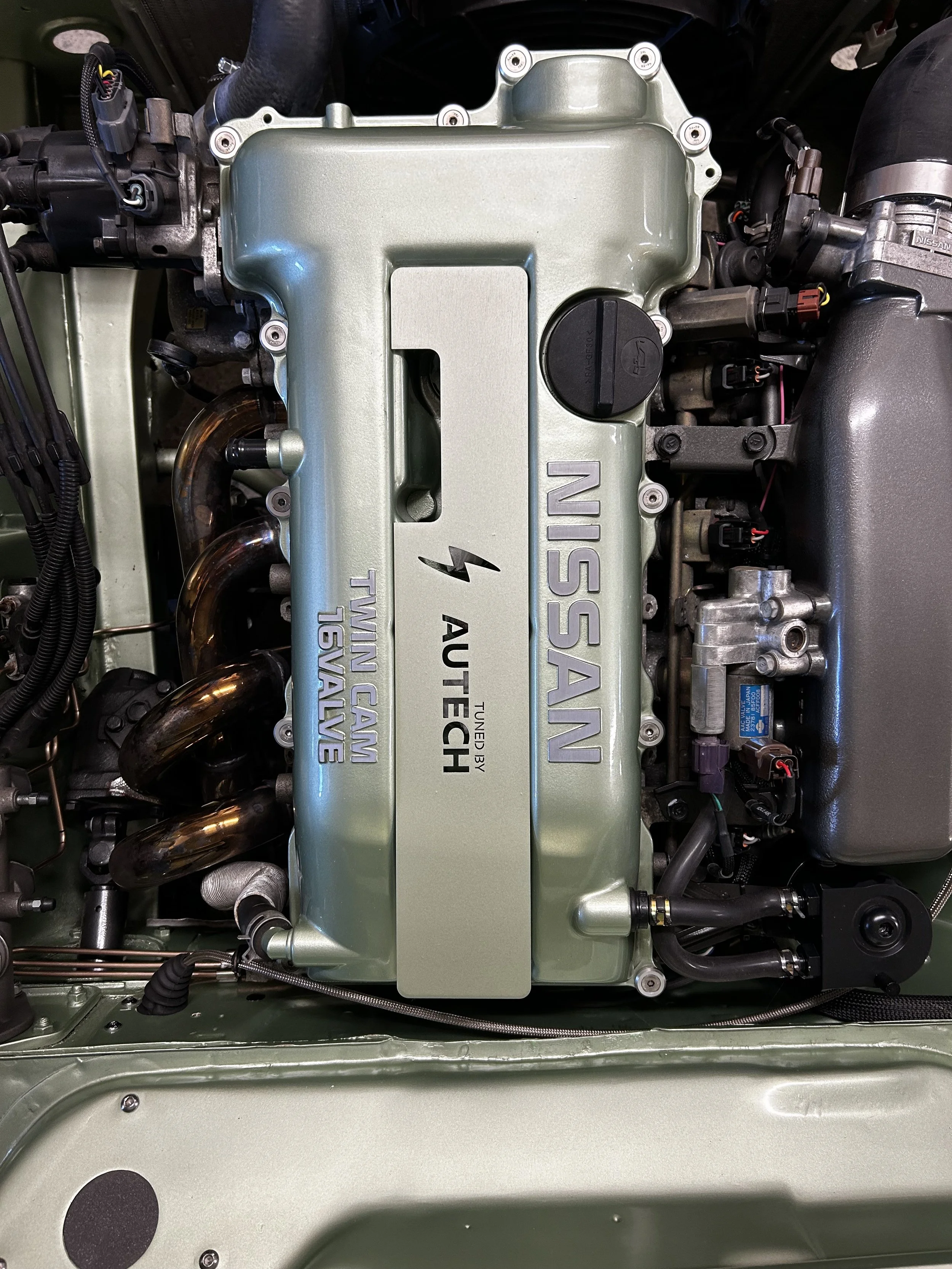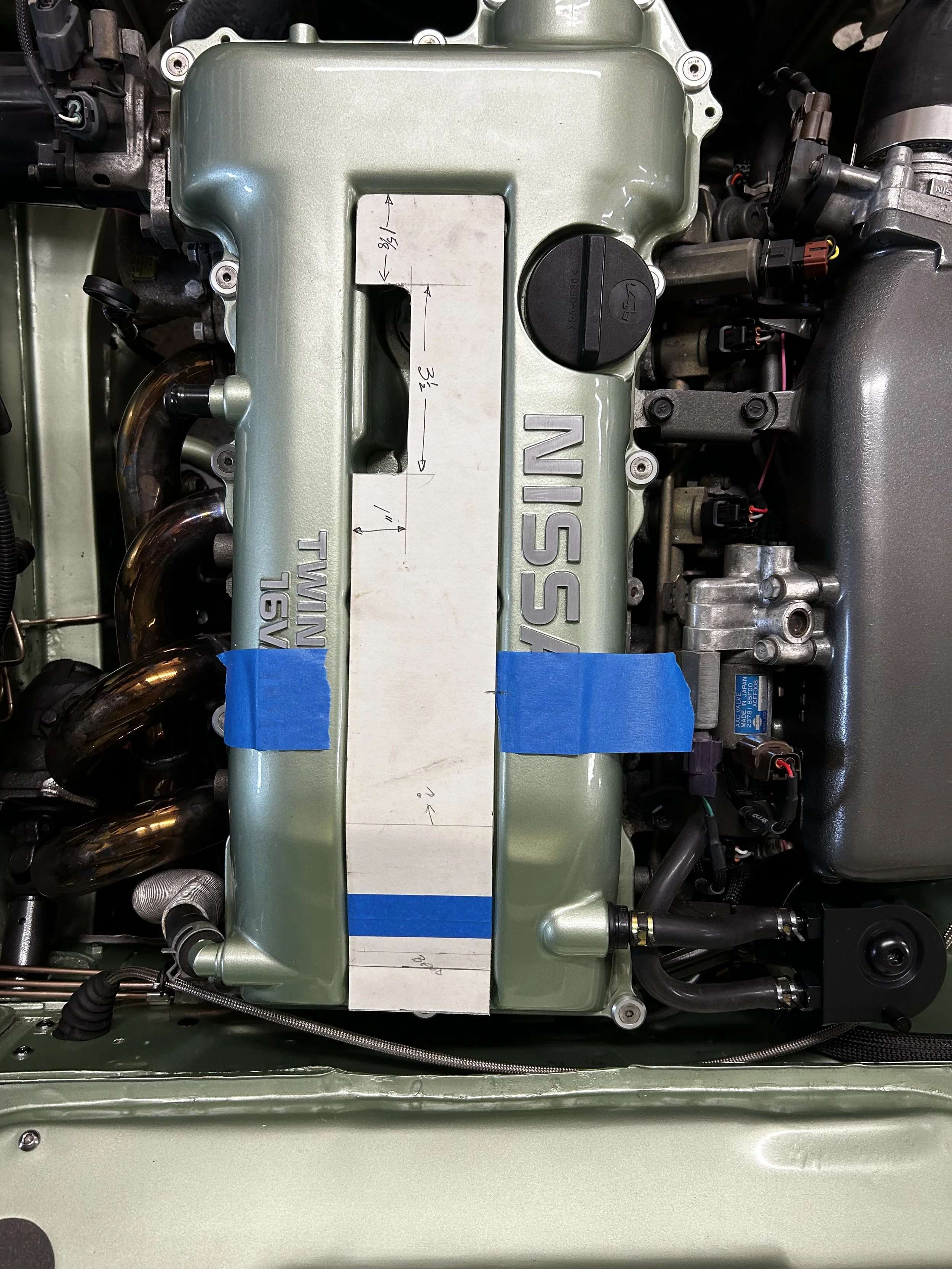 While the painted valve cover looked great, the black spark plug wires running into the center needed a solution. We mocked up a paper template and then created a layout in Indesign, ultimately using SendCutSend to have the piece laser cut. I also wanted a way to visualize the uniqueness of this engine. Being a JDM version tuned by Autech, I used a Nissan font to describe that, matching the font style on the valve cover. I also recreated the Silvia logo as a subtle node to the JDM version of the car this engine came out of. We had one prototype laser cut, making some adjustments to the font location and length of the part. Above you can see the final version (without screws).
