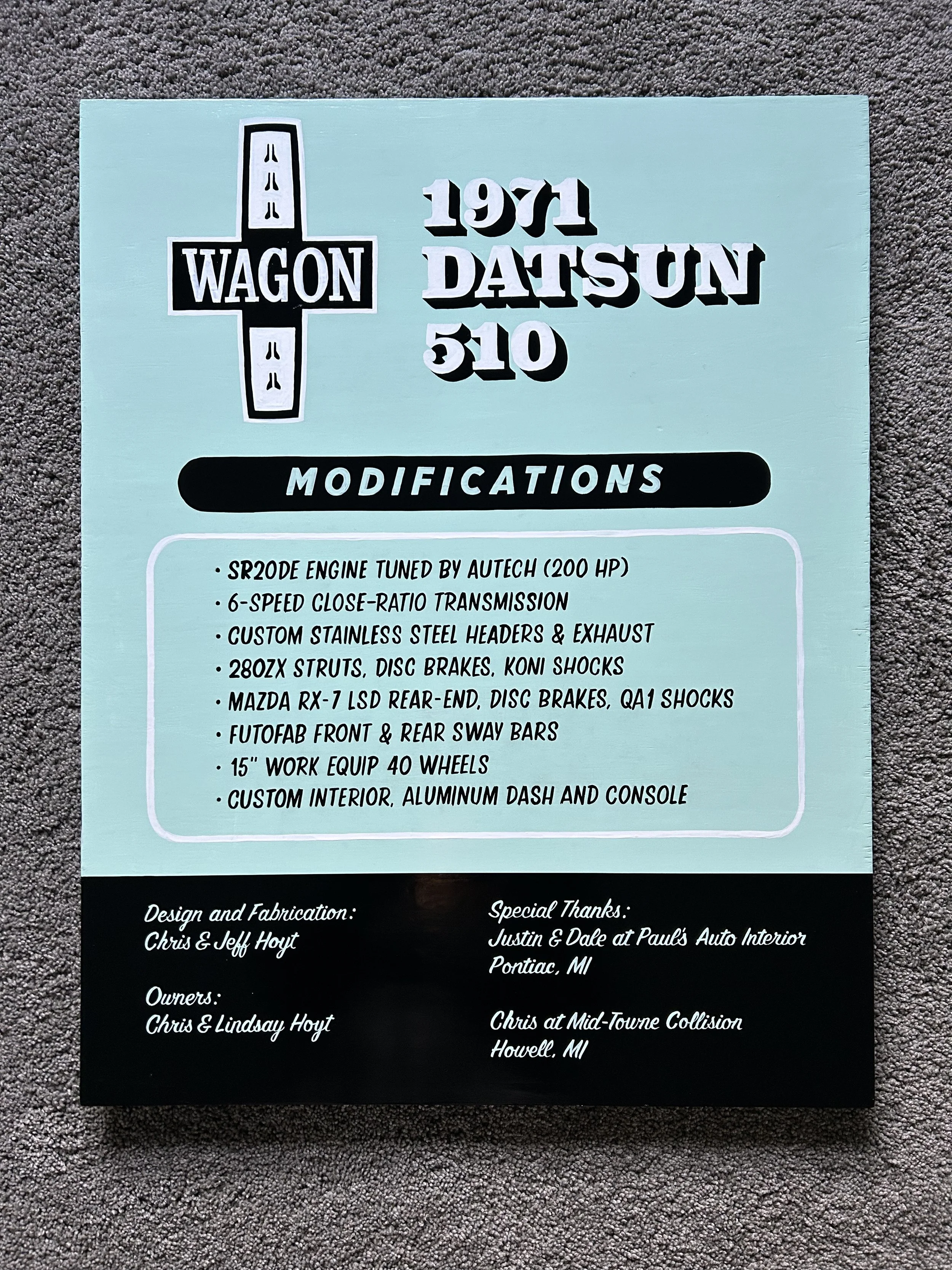 Special thanks to Dave Battjes for the wonderful showboard. I really wanted an old school look, which required hand painting all the letter. Luckily, Dave is located in Grand Rapids and was able to help. We worked together to create an awesome board incorporating the Datsun Wagon emblem found on Canadian models.