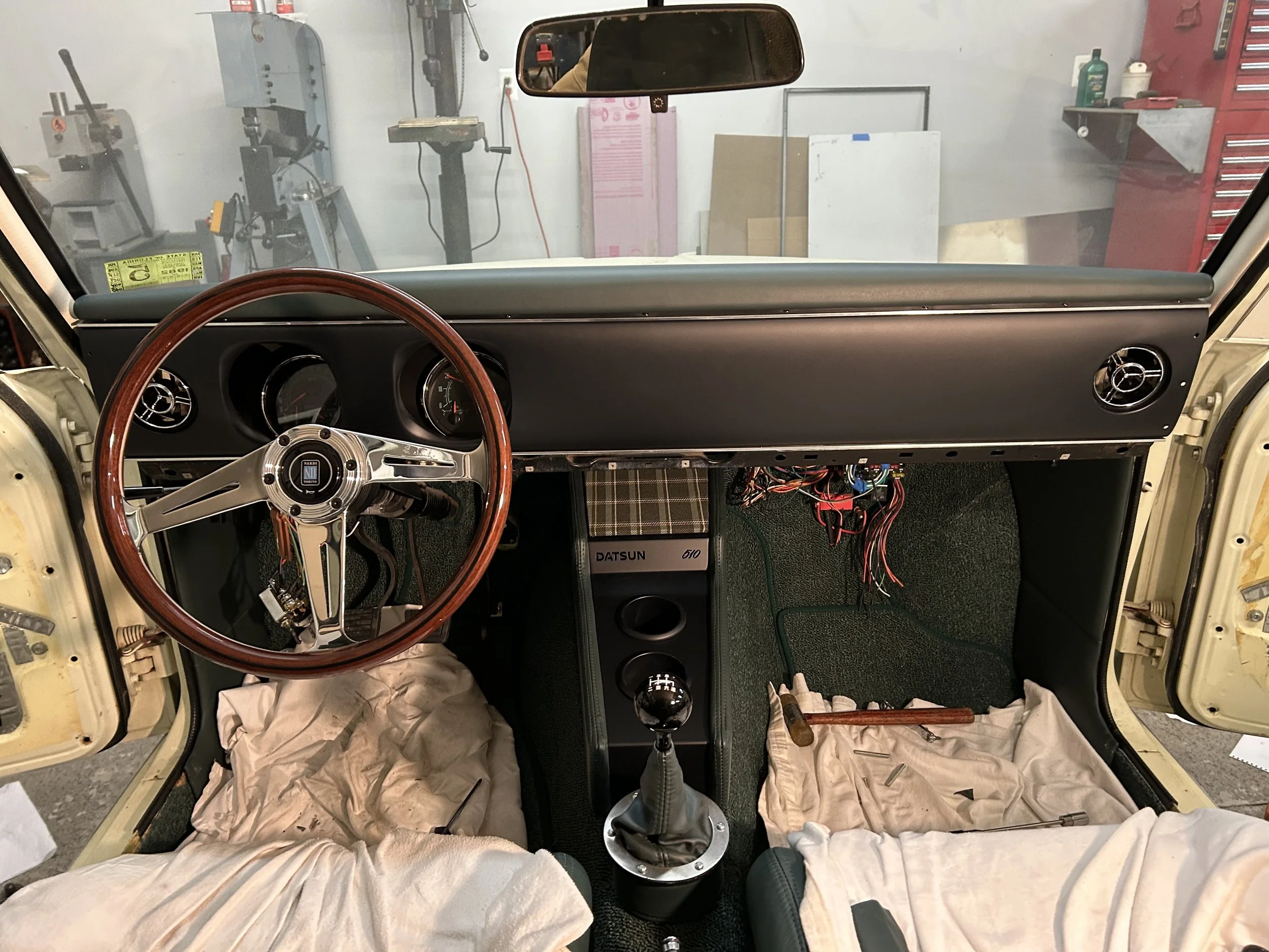 What inspired the dashboard? In the 1969 model year, the 510 dashboard had a very linear look and didn’t have the notch out in the center of the dash pad for the heater controls. I really like the clean look of that and the “chrome trim” that runs horizontally across the top and bottom of the dash. Taking inspiration from that model year, we simplified the dash and hand formed a custom aluminum dashboard. The top dash pad is also custom, keeping the shape similar to the original, but removing the center notch out area. That pad was then wrapped in leather at the trim shop.
